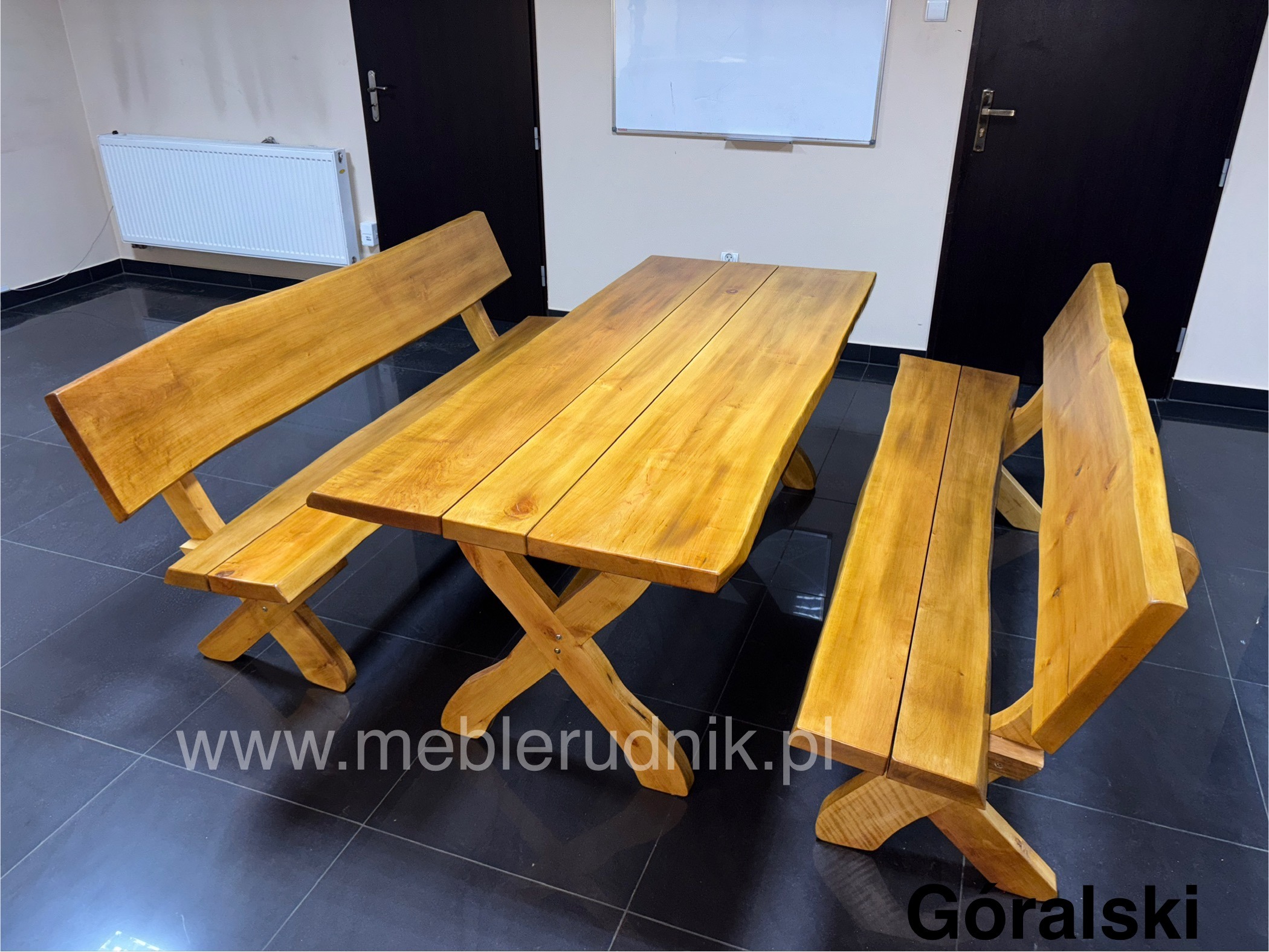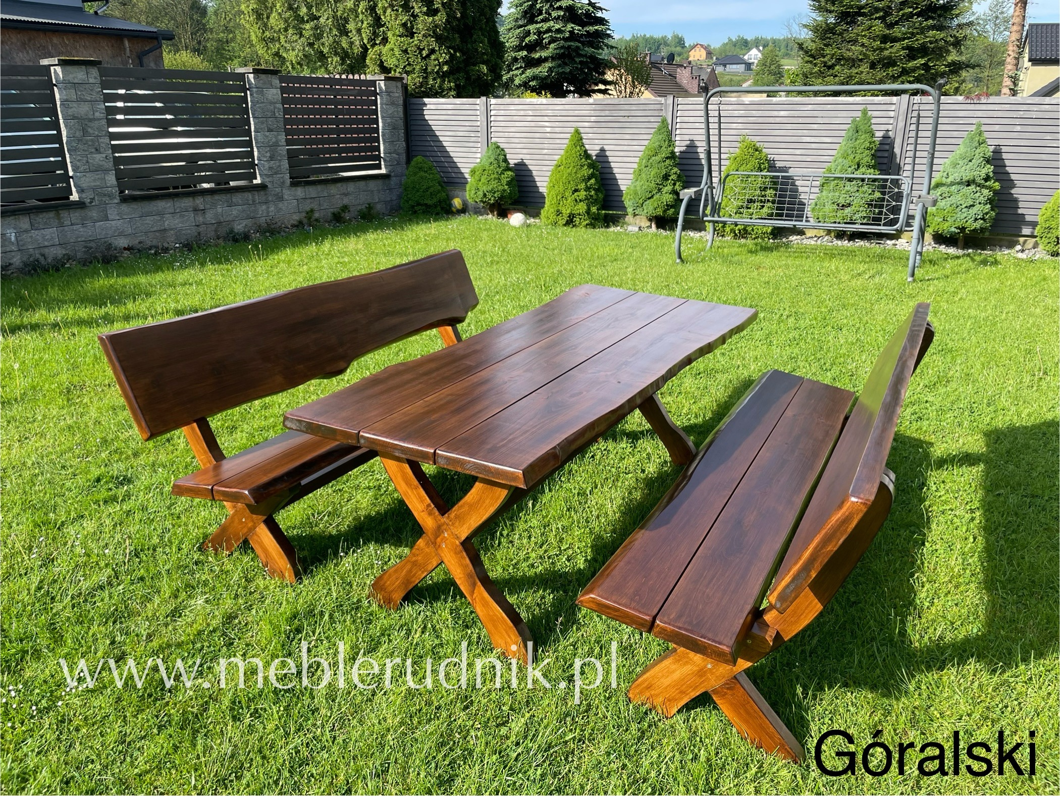Komplety mebli ogrodowych drewnianych GÓRALSKICH wykonane z drewna olchowego o grubości 4,7cm. Malowane dwukrotnie lakierobejcą. Meble wykonujemy standardowo w rozmiarze 200cm.